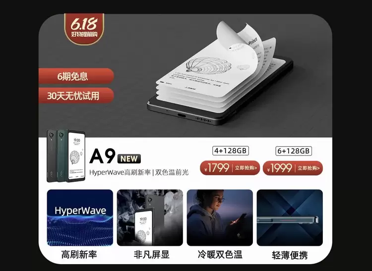 目前,海信阅读手机A9已在京东平台现货开售,4GB+128GB版本1799元,6GB+128GB版本1999元。现在购买海信阅读手机A9,还可享受6期分期免息、以旧换新至高补贴590元、6月3日-18日直播抽至高999元E卡等超多好礼,各位喜欢阅读的朋友们不要错过。