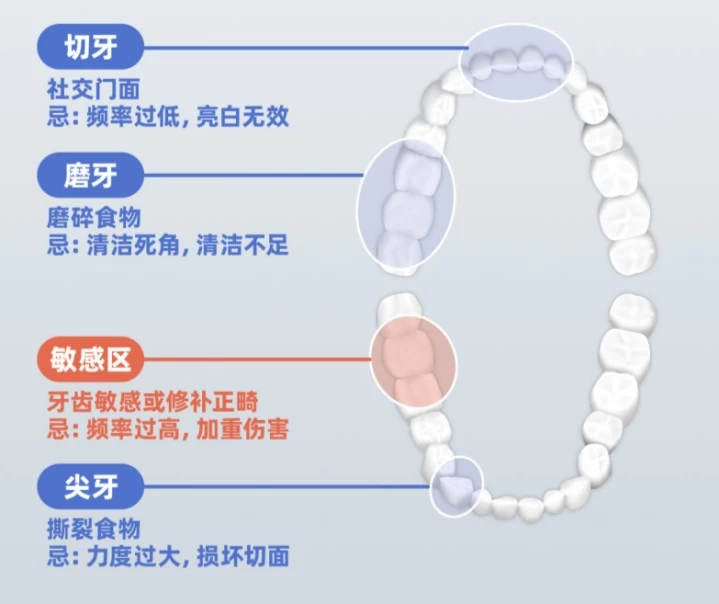在人的口腔中每个区域的牙齿形状不同、分工不同,其受磨损程度及藏污纳垢的程度也不同,需要使用不同的频率及力度来进行「区别清洁」!