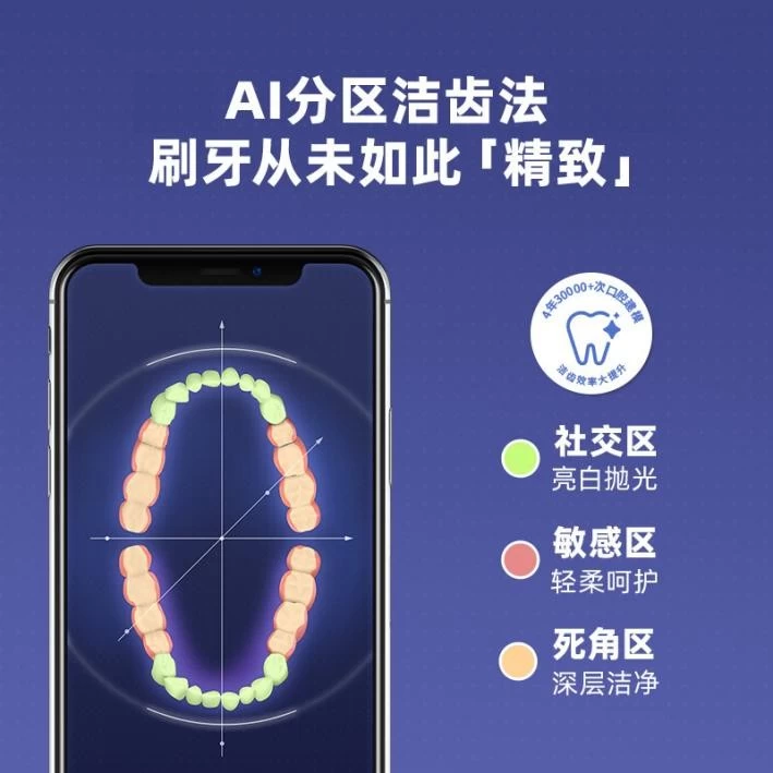 当用户的刷牙部位更换时,牙刷内的AI芯片能以微秒级运算,自主学习、记忆用户的刷牙习惯,让16个分区的牙齿都能进行不同频率的针对性清洁,达到整个口腔内完整的高效洁齿。