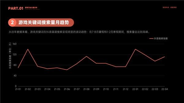 2.游戏关键词在抖音渠道搜索呈现明显的波动趋势:在7-8月暑假和1-2月寒假期间,搜索量会达到高峰。