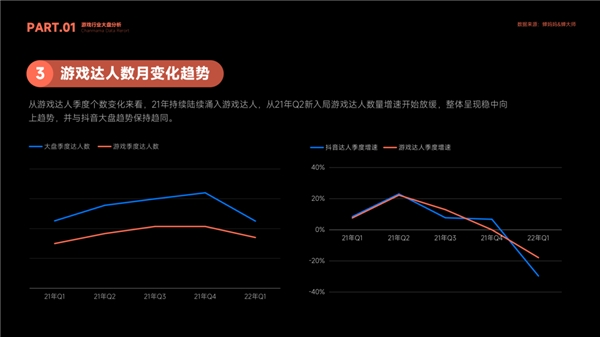 3.从2021年Q2新入局游戏达人数量增速开始放缓:整体呈现稳中向上趋势,并与抖音大盘趋势保持趋同。