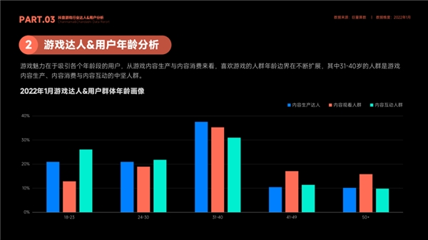 从游戏内容生产与内容消费来看,喜欢游戏的人群年龄边界在不断扩展,其中31-40岁的人群是游戏内容生产、内容消费与内容互动的中坚人群。