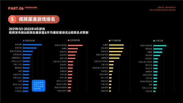 而在游戏内容创作方面,游戏视频发布数在2021年Q2环比增速达到全年最高,2022年Q1同比增速远超抖音大盘。从整年视频播放量来看,行业内容消费从增量阶段迈入存量阶段。