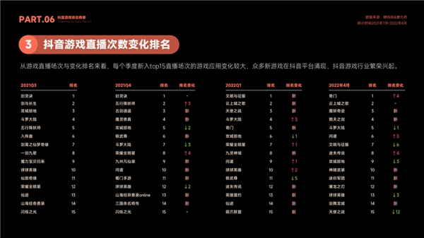 从游戏直播场次与变化排名来看,每个季度新入top15直播场次的游戏应用变化较大,众多新游戏在抖音平台涌现,抖音游戏行业繁荣兴起。