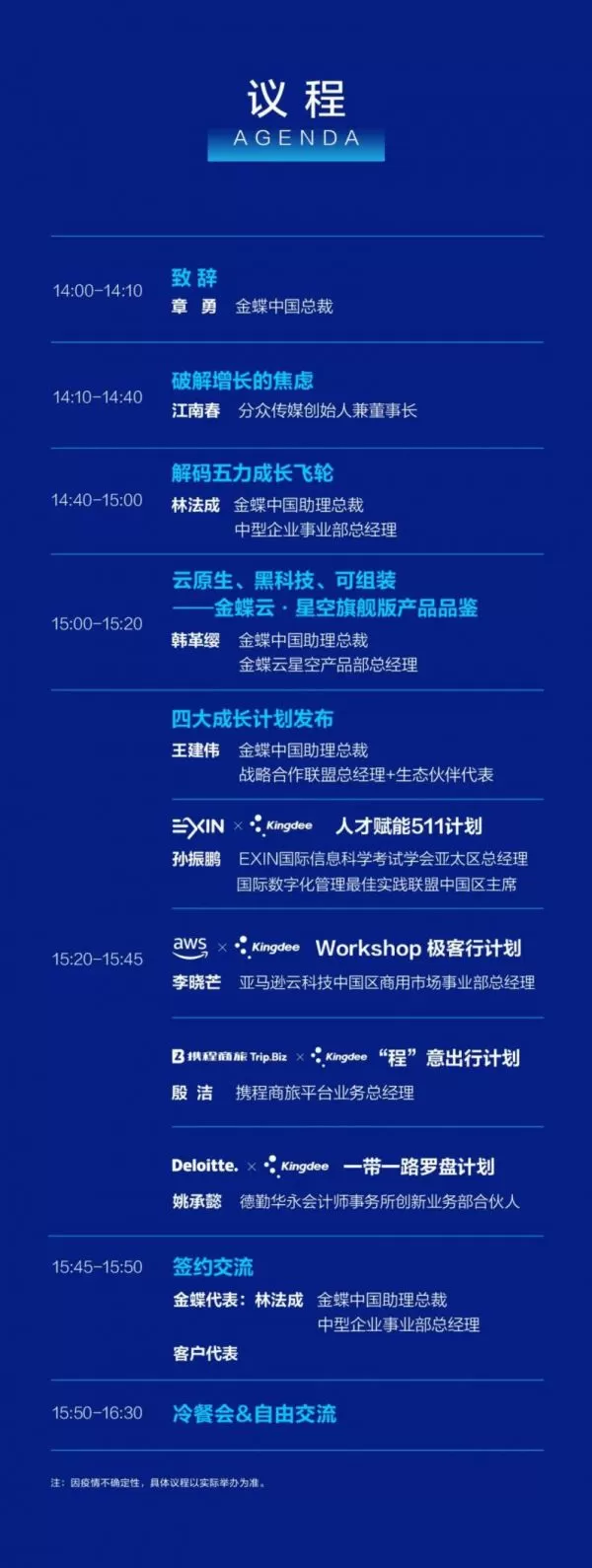 EXIN国际信息科学考试学会、亚马逊云、携程商旅、德勤等四大生态伙伴将与金蝶共同实施成长计划,如EXIN X Kingdee-『人才赋能511计划』、AWS X Kingdee-『Workshop极客行计划』、携程商旅 X 金蝶-『“程”意出行计划』、德勤 X 金蝶-『一带一路罗盘计划』等,未来将为企业用户提供人才培训、咨询服务、认证课程等数字化管理能力升级服务,培养国际化视野数字化管理人才,构建企业技术架构平台,真正为企业发展焦虑纾困解难。