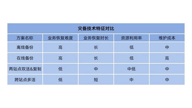 对比几种灾备技术特征可以发现,在业务恢复难度和时长方面,由于备份涉及多次的数据拷贝和回拷,恢复难度较高且耗时较长;在资源利用率方面,利用传统备份和复制技术,备份数据目的端通常不直接承载现网业务,会造成部分业务资源浪费;在运维成本方面,双活、多活技术故障场景业务感知小,切换迅速快捷,且无需人工设置备份/恢复规则,更方便客户侧运维人员操作和实施。