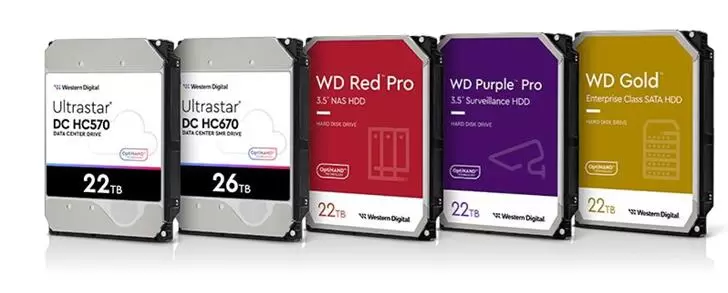 从左到右依次为:西部数据22TB Ultrastar DC HC570 HDD、26TB Ultrastar DC HC670 UltraSMR HDD、WD Red Pro 22TB HDD、WD Purple Pro 22TB HDD、WD Gold 22TB HDD