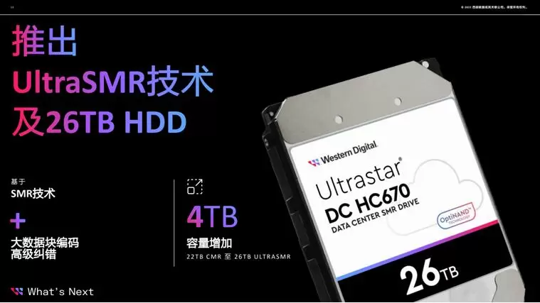 发布会上,西部数据发布了全新的CMR技术的22TB Ultrastar DC HC570 HDD和UltraSMR技术的26TBUltrastar DC HC670 HDD,为超大型的数据中心提供更好的、更稳定的存储解决方案,并且能够帮助云服务客户显著降低存储总体拥有成本(TCO),进而使得这些企业获得更持续、快速的业务发展。