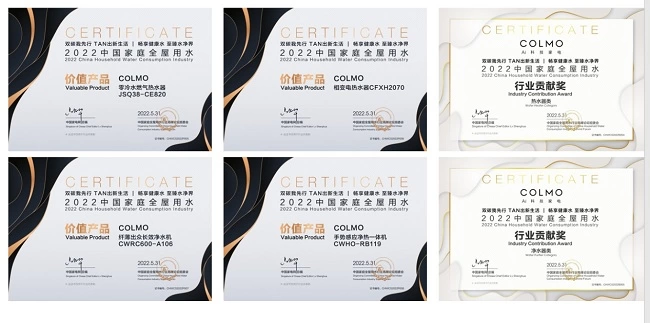 5月31日,由中国家用电器协会指导、中国家电网主办的“双碳我先行 TAN出新生活 畅享健康水 至臻水世界”2022中国家庭全屋用水行业高峰论坛在京成功举办,多家知名家电品牌及相关行业企业线上云聚于此,对全屋净水行业近年来的趋势与变化进行了深入且有意义的探讨,深度剖析并积极建言,为大家奉上了一场智慧与思考碰撞的盛宴。此次论坛活动中,主办方评选出在“家庭全屋用水”行业贡献类、产品类、渠道类等多系列重量级奖项,高端AI科技家电品牌COLMO脱颖而出,一举斩获电热水器—防腐技术、燃气热水器—零冷水技术、净水机—滤芯技术等9大奖项,是行业对COLMO的又一肯定和认可。