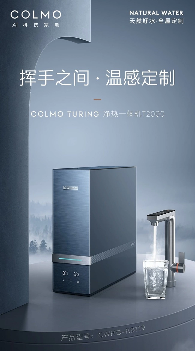 COLMO TURING净热一体机T2000作为一款为菁英用户带来全感官体验的创新净水机,拥有深邃内敛的锆石蓝机身,格调优雅,风格百搭。净热一体功能告别净水、烧水、保温繁琐步骤,无论是清晨唤醒身体的第一杯温水,还是给宝宝冲泡的第一杯奶,都可以快速满足,贴心关怀带给用户安全和高品质的饮水生活。COLMO TURING净热一体机T2000同时配置手势龙头,无需触摸即可控制,挥手间即刻舒享宜温净饮,为使用者解锁专属温度,便捷无菌拒绝一切繁琐复杂。产品内置2L聚热隔菌仓内胆,有效保障水路全程与空气零接触,从源头防止细菌污染,打造健康无菌闭环。不同于市场上添加部分化学阻垢剂的传统净水机,COLMO TURING净热一体机T2000采用纯物理过滤,对饮水进行了升华净滤,全方位阻绝化学沉淀,构建更适合国人的家庭饮用水模式。