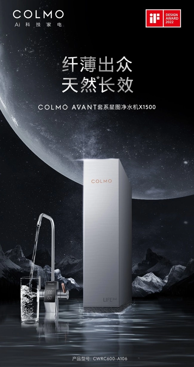 家庭环境的健康,离不开天然好水的浸润。COLMO AVANT星图净水机X1500搭载行业首创的双RO反渗透过滤技术,全球甄选滤材保持六年长效智净,降低产品换芯频率亦能实现长效净化,让消费者不被定期更换的生活难题困扰。105mm纤薄身姿尽显极简美学,橱下或边柜都能巧妙收纳,节约空间重塑理享厨房。COLMO AVANT星图净水机X1500贯彻绿色环保理念,环保可回收机身增加产品再利用的可能,令环保成为一种生活方式,打造人、居、自然和谐共生图景。COLMO精研思维智净科技,产品特别搭载AI龙头,可根据水质情况及用水量智调运行状态,鲜活好水尽在掌握。