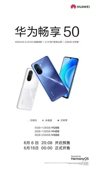 华为畅享50目前已开启预售,将于6月16日零点正式开售。6GB+128GB售价1299元,8GB+128GB售价1499元,8GB+256GB售价1699元,用户可登录华为商城及各大授权电商平台或前往线下门店进行购买。