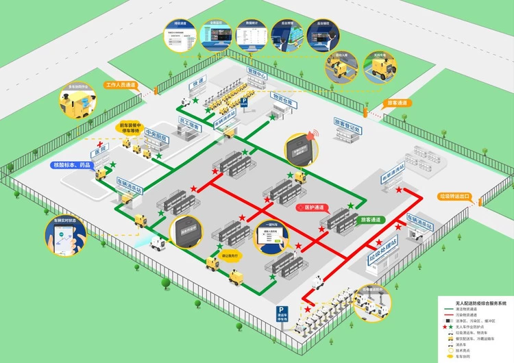 行深智能无人车方舱医院解决方案由无人配送防疫综合服务系统,物资配送防护通道,3个作业区域,4个作业点,5种L4级无人车。通过这套方案,实现几十台甚至上百台无人车在方舱有序配合,高效服务。