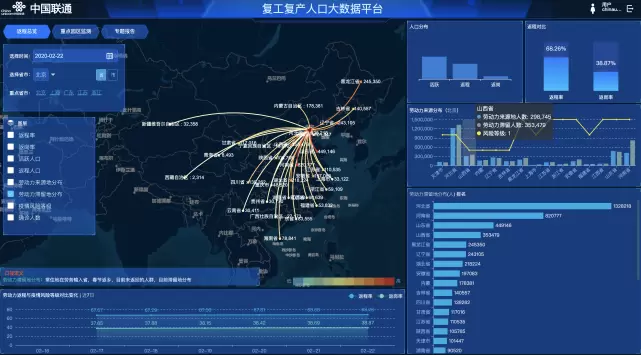 为了进一步为促进复工复产做好精准有力支撑,中国联通在做好防疫抗疫相关工作的前提下,依托自身海量大数据优势,以手机信令数据建立模型分析全国31省/直辖市、334个地级市的人口分布、人口流入流出、职住人口趋势、劳动力人口的返城率、劳务输出省人口流出趋势等,以直观的可视化平台形式展现市、重点区域复工复产情况。