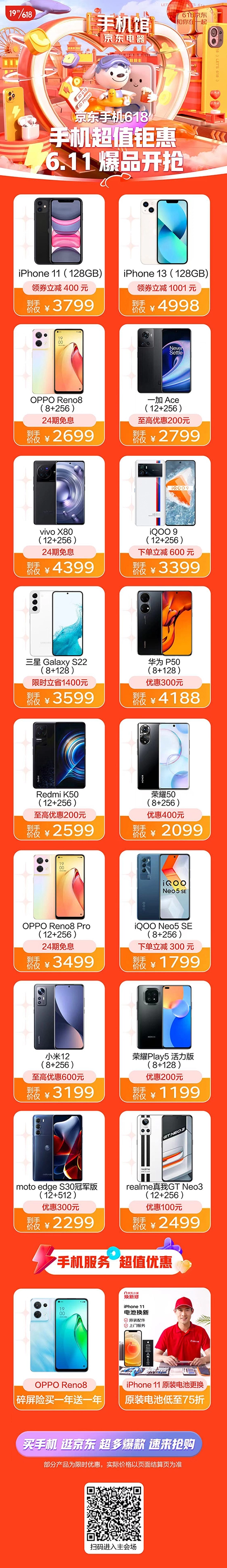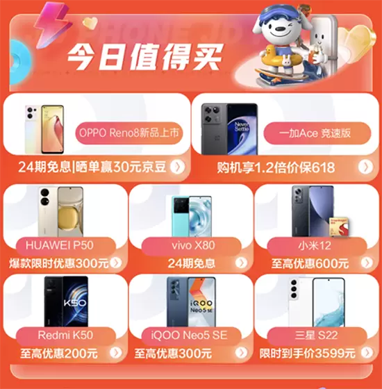 一加Ace竞速版,搭载天玑8100-MAX处理器,采用120Hz变速电竞直屏、6400万全场景三摄,支持多功能NFC,京东购机可享1.2倍价保。OPPO Reno8新品上市,京东618购机可享24期免息。不仅如此,还有多款手机值得入手。其中,iQOO Neo5 SE至高优惠300元、三星S22限时到手价3599元、Redmi K50至高优惠200元、荣耀70新品上市至高12期免息、华为P50爆款限时优惠300元、vivo X80可享6期免息。