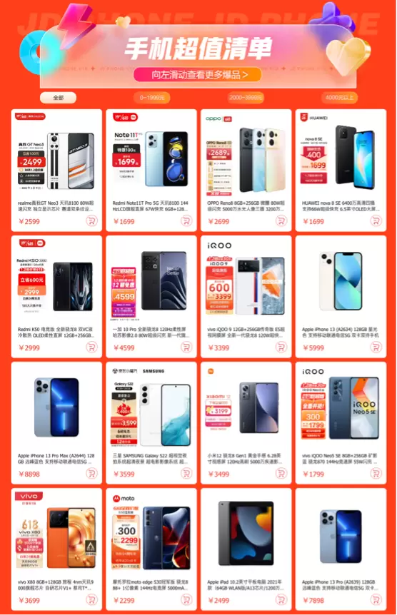 京东手机618除了今日值得买专区外,还推出了手机超值清单,不仅帮你从海量产品中选出最值得买的,还贴心分出了不同价格段,更方便用户根据预算来挑选手机。如果你预算有限,2000元以内可以考虑性能小金刚Redmi Note11T Pro、荣耀X30、华为Nova8 SE这几款,2000-4000的话可以考虑小米12、OPPO Reno7、真我GT Neo3、Redim K50电竞版等,预算4000元以上的话可以选择iPhone 13 Pro、一加10 Pro、荣耀Magci4、华为P50、OPPO Find N等。