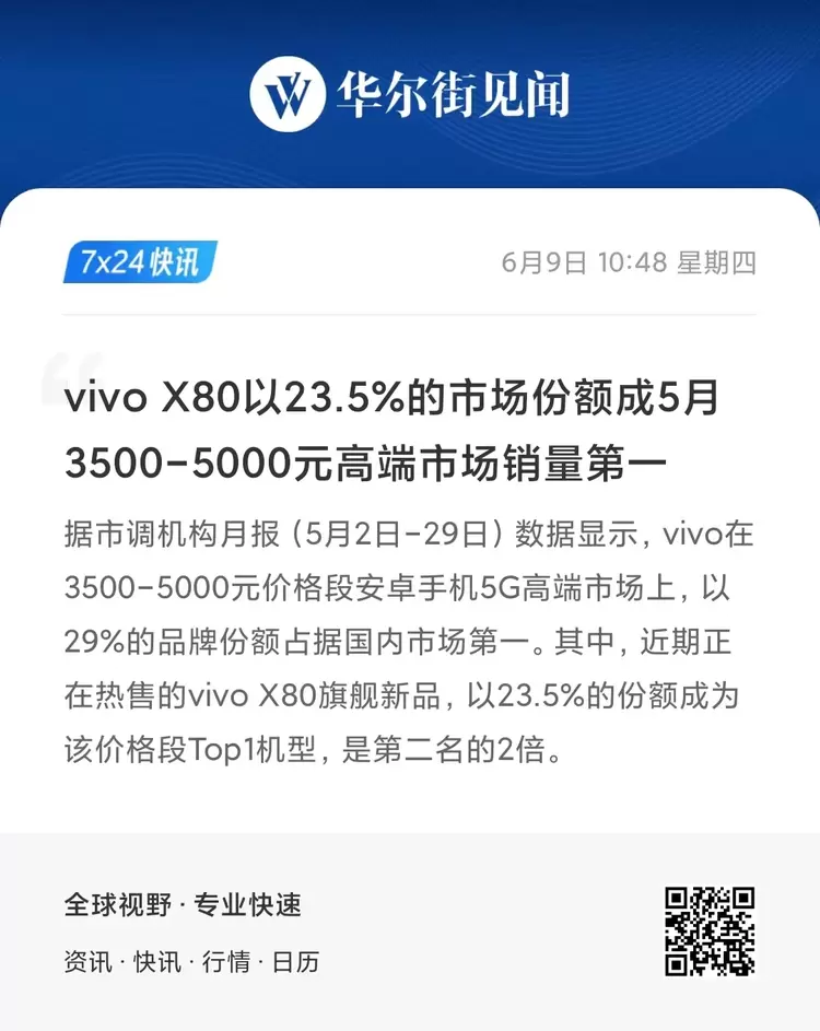 据相关媒体报道显示,5月份(5月2-29日)3500-5000 元价格段安卓手机 5G 高端市场上,vivo以29%的品牌份额占据国内市场第一。其中vivo X80以23.5%的份额成为该价格段Top1机型,是第二名的两倍。