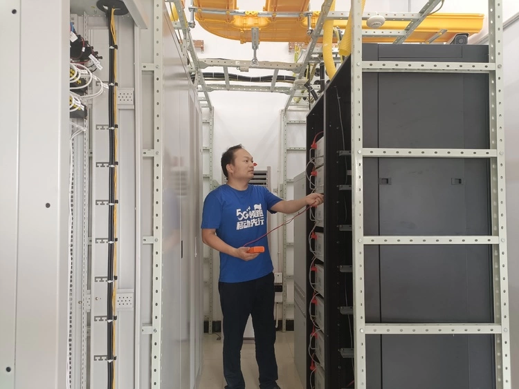 图注:在大王光伏5G机房内,移动技术人员检查设备运行状况