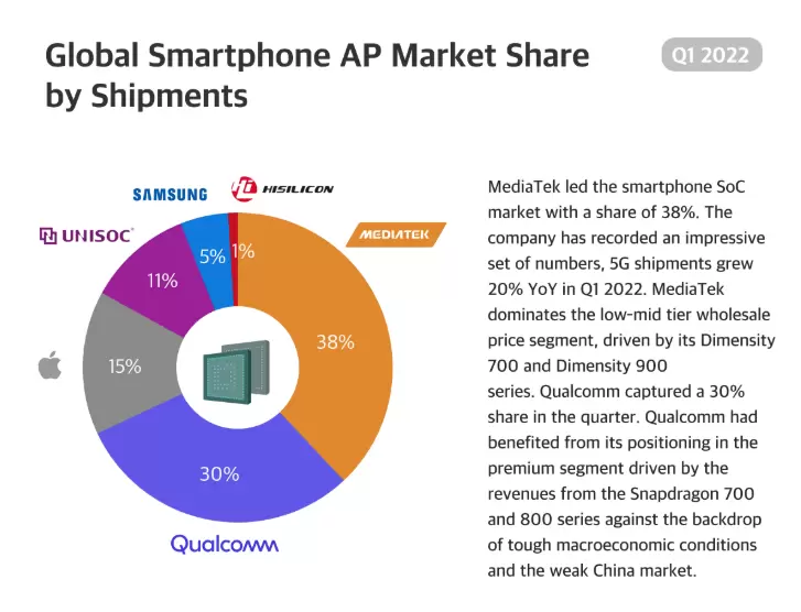最近,知名半导体数据调查机构Counterpoint Research 最近公布了2022年第一季度全球智能手机AP/SoC芯片组出货量统计数据,第一名毫无悬念的落到了联发科头上,联发科以 38% 的市场份额引领智能手机 SoC 市场。这已经是联发科连续七个季度在手机芯片出货量排行榜上登顶,在天玑9000、天玑8000系列芯片大受欢迎的当下,联发科市占率的持续领先不难预料。