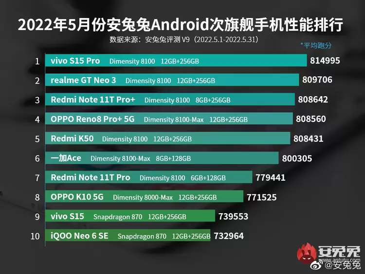 天玑8000系列芯片霸榜5月安兔兔安卓次旗舰手机性能排行榜(图源网络)