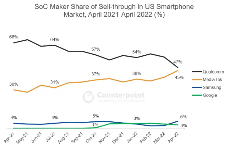 Counterpoint研究主管 Jeff Fieldhack表示:“联发科的增长令人印象深刻,现在它正在寻求瞄准美国智能手机市场的中端和高端市场。联发科最近发布其 天玑1050 芯片组,是旗下首款支持毫米波的 5G 芯片组。该芯片组能帮助联发科在中端和高端领域的竞争中取胜。”