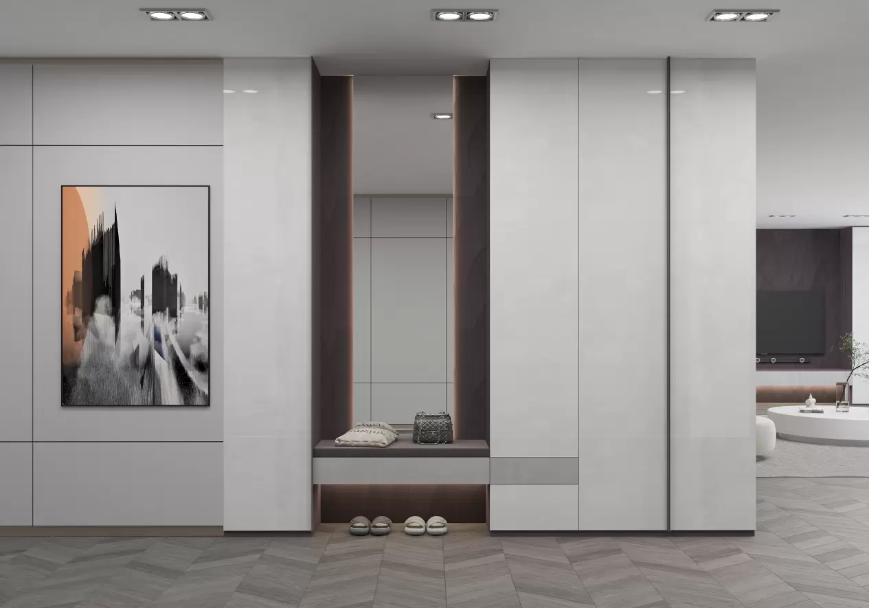海尔全屋家居亮光云海纹理PET门板,选用婴儿奶瓶同款材料,细腻如肌肤般触感。2700mm一门到顶超高柜,搭配一体式一字型把手,让每一次开合都充满惊喜。