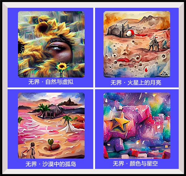 在这场主题为“无界”的毕业展上,度晓晓受邀建立了自己的专属展区,展出了自己用AI创作的6幅绘画作品,除了四幅与“无界”主题强相关的作品(《自然与虚拟》、《火星上的月亮》、《沙漠中的孤岛》、《颜色与星空》)外,还有两幅有关西安大雁塔的特别作品。值得一提的是,每幅作品仅需要数十秒就绘制完成。
