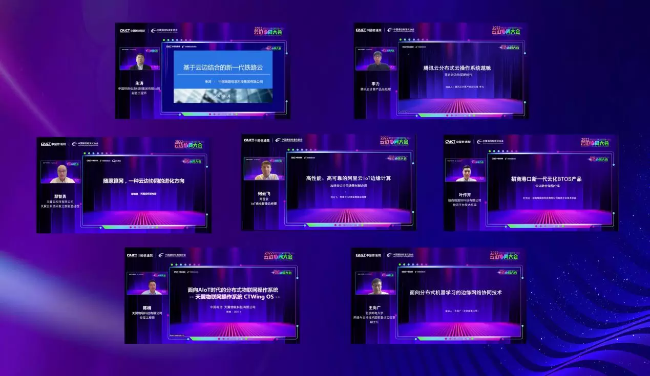 中国铁路信息科技集团有限公司副总工程师朱涛带来了题为《基于云边结合的新一代铁路云》的演讲,腾讯云计算产品总经理李力分享了《腾讯云分布式云操作系统遨驰,开启云边协同新时代》,天翼云科技有限公司研发三部副总经理鄢智勇介绍了《随愿算网,一种云边协同的进化方向》,阿里云IoT商业智能总经理何云飞带来《高性能、高可靠的边缘计算服务》的演讲,招商局国际科技有限公司物流平台技术总监叶传开分享了《招商港口新一代云化BTOS产品分享》,天翼物联科技有限公司资深工程师陈楠带来了《面向AIoT时代的分布式物联网操作系统》的演讲,北京邮电大学网络与交换技术国家重点实验室副主任王尚广分享了《面向分布式机器学习的边缘网络协同技术》。