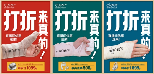 趁着618各品牌抢占渠道变现,国际智能声学品牌Cleer创意的促销设计语言,给用户呈现了这个品牌一致的感官体验:独特。手臂上的绷带,“新折学”,“骨折价”的创意思路也引发了抖音上不少达人模仿,接下来更加期待618的到来,小编也希望趁着这波“骨折价”入手一部心心念的开放式耳机呢。