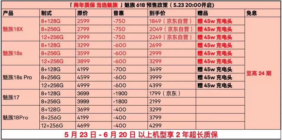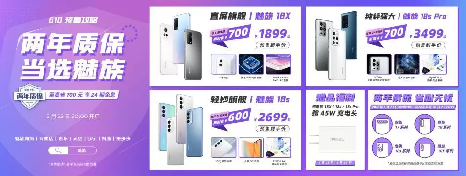 魅族科技为了感恩用户,在618年中大促活动中,推出诸多购机送福利活动,2022年5月23日00:00:00-2022年6月20日23:59:59;魅族618两年质保,预售福利来袭:今日20:00起,购机享2年质保,至高立省700元,享24期免息!5月31日前购魅族18X、魅族18s系列赠45W超充适配器。更多直播福利、会员活动、以旧换新等专属权益请关注魅族商城、魅族专卖店及各大电商平台!