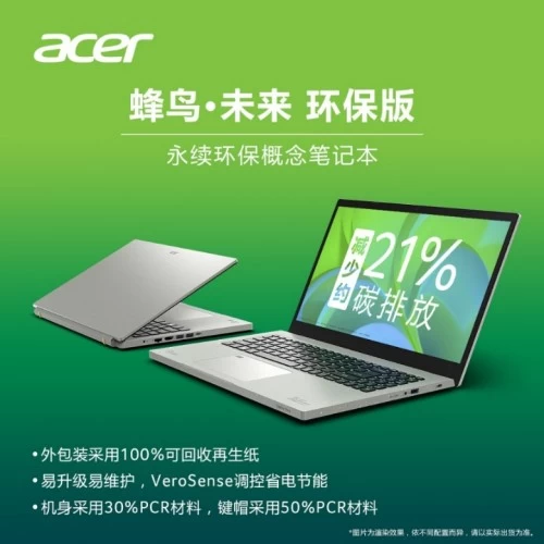 凝结了宏碁永续理念与多年实践经验的成果,蜂鸟·未来环保版不只是一台永续理念的笔记本,更是为宏碁未来环保系列奠定了基础的设计思路。30%PCR机身与50%PCR键盘所打造的蜂鸟·未来环保版,仅生产环节便减少21%碳排放;同时其采用的100%可回收材质包装与可做笔记本支架的电源保护壳设计,更多次荣获设计大奖,全面印证宏碁环保举措的先锋性与创新性。