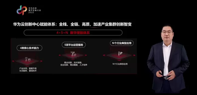 华为云创新中心针对平台服务,承载产业创新的致远理想,提出了新的架构,加速产业集群创新智变。刘少华详细分享了华为云创新中心“4+5+N”的数字使能体系架构: