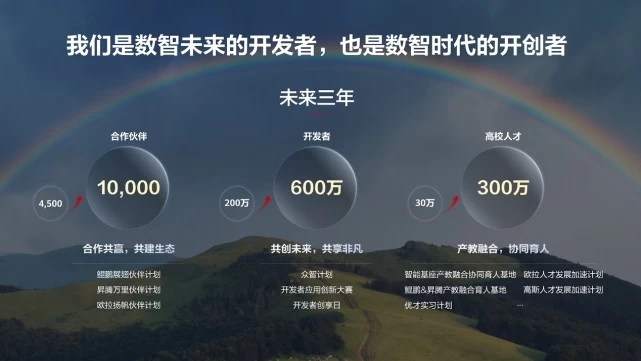 鲲鹏、昇腾计算产业的高速发展,离不开生态伙伴和开发者的共同努力。未来三年,华为将计划发展万家合作伙伴、600万开发者,培养300万鲲鹏、昇腾原生的高校人才,全面加速计算产业生态发展,共赢数智新时代,共创数智新未来!