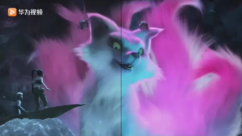 历经劫难的小青来到宝青坊后,宝青坊主忽然变成了一只巨大的狐狸,狐狸尾部及身体反射的色彩能否正确且完美的显示出来,展示出电影奇幻的写意感,十分考验影片和显示设备的色域范围。当色域低于标准值(100%sRGB)时,就如左侧的画面一般,画面暗淡,狐狸面部的颜色已趋于灰白,影片展示给观众的色彩就无法体现,而在华为视频AiMax影院上线的影片,经过广色域自适应补偿技术处理后,粉紫色与青绿色的色域覆盖范围得到充分延伸,细腻的过渡颜色清晰可辨,色彩的精雕细琢充分体现了这只变异“狐狸”的神秘感与巨大震慑力。