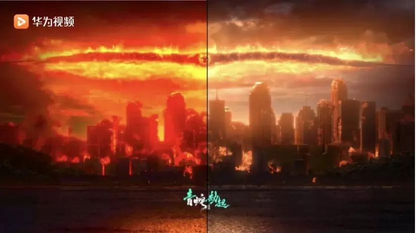 当幽灵席卷整个修罗界,满身赤红的火焰,拥有强大破坏力的幽灵,所到之处只剩下一片残骸。在上图对比画面中可以发现,当色域严重超出最适范围时,就会出现像类似图中的过饱和情况,天空的云层通红一片,云层细节丢失明显,画面失去了因不同色彩带来的层次感,而在华为视频AiMax影院上线的影片得到广色域自适应补偿技术的进一步优化,红色、橙色、黄色三个色彩的显示清晰可辨,颜色之间的过度真实自然,让观众更好的感受到因神秘怪物那划破天空的烈焰,所带来的恐惧感、压迫感。