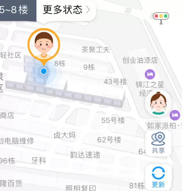 首先去吃个饭,记得是在二楼大家乐吃,打开绑定孩子小天才旗舰Z8的手机app后,定位显示还挺准的。估摸过了20多分钟,孩子先吃完,自己跑到餐厅外面玩,这时我手机刷新了定位,没想到孩子跑到隔壁栋楼去了,而且还是三楼。在我赶过去见到孩子后,他说听到有人唱歌就过来听,还真是,他对面就是魅KTV,门口有驻唱歌手在唱歌。