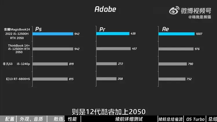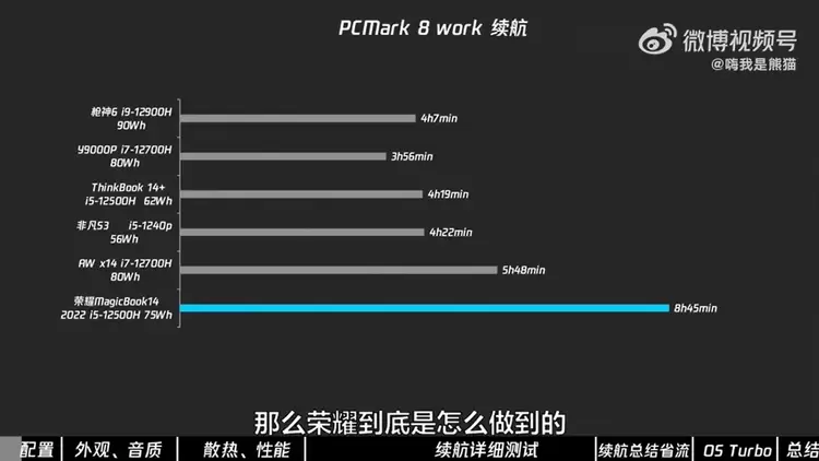在实际体验中,无论是日常办公还是专业渲染,亦或是游戏场景下,全新荣耀MagicBook 14都可以有优于同级产品的表现。在媒体测试中,PS、Pr和AE等大型软件测试中,分数均是对比产品中最高的,同时在续航软件测试中的成绩达到了近9小时,遥遥领先其他产品,足见这款产品的实力。