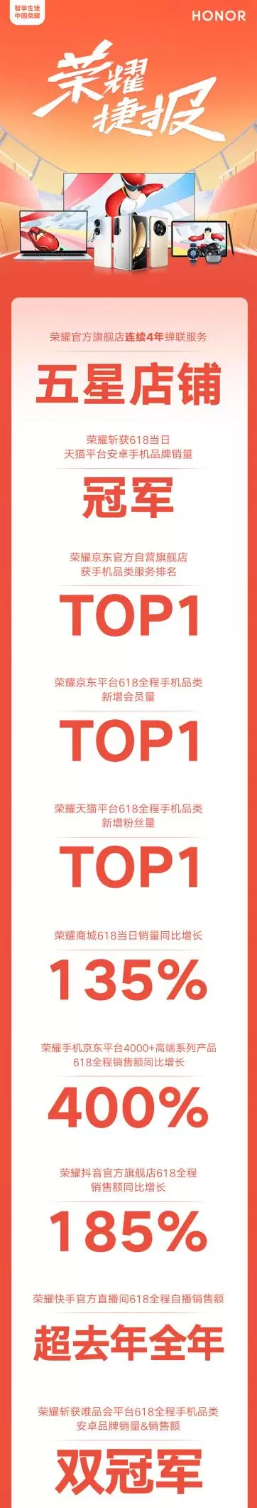 荣耀618收官战报:斩获多平台销量、销售额双冠军头衔 技术外溢效应凸显