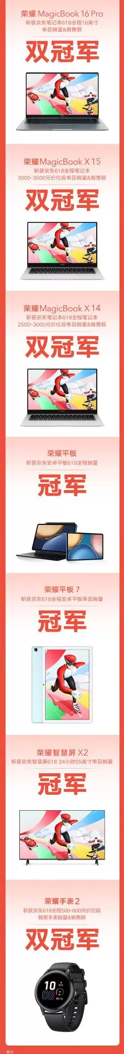 不只是手机,荣耀全场景产品表现都很出色。荣耀MagicBook 16 Pro斩获京东笔记本618全程16英寸单品销量&销售额双冠军;荣耀MagicBook X15斩获京东618全程笔记本3000-3500元价位段单品销量&销售额双冠军;荣耀平板斩获京东安卓平板618全程销量冠军;荣耀智慧屏X2斩获京东智慧屏618 24小时55英寸单品销量冠军;荣耀手表2斩获京东618全程500-600元价位段智能手表销量&销售额双冠军。