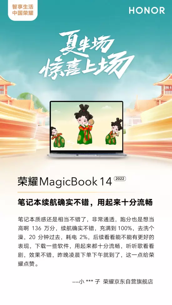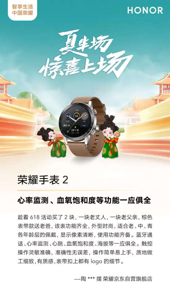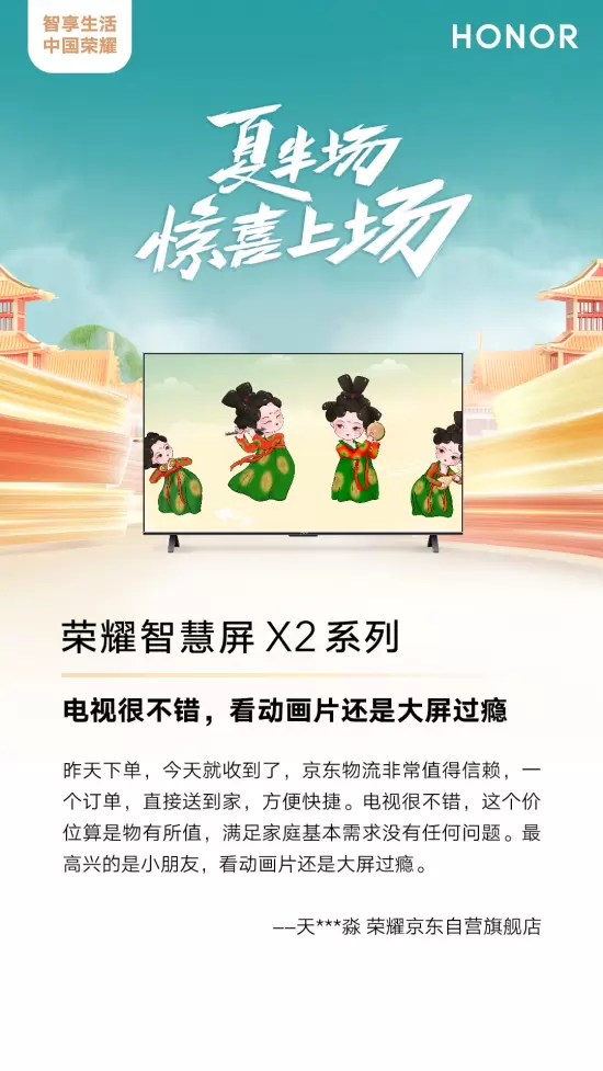 荣耀产品为何如此受到追捧,我们或许可以在众多用户的评价中,得到一些回答。例如,用户在评价荣耀MagicBook 14时称““笔记本续航不错,用起来十分流畅”;用户评价荣耀智慧屏X2称“电视很不错,看动画片还是大屏过瘾”。对于耀手表2,也给出了“心率监测、血氧饱和度等功能一应俱全”的评价。