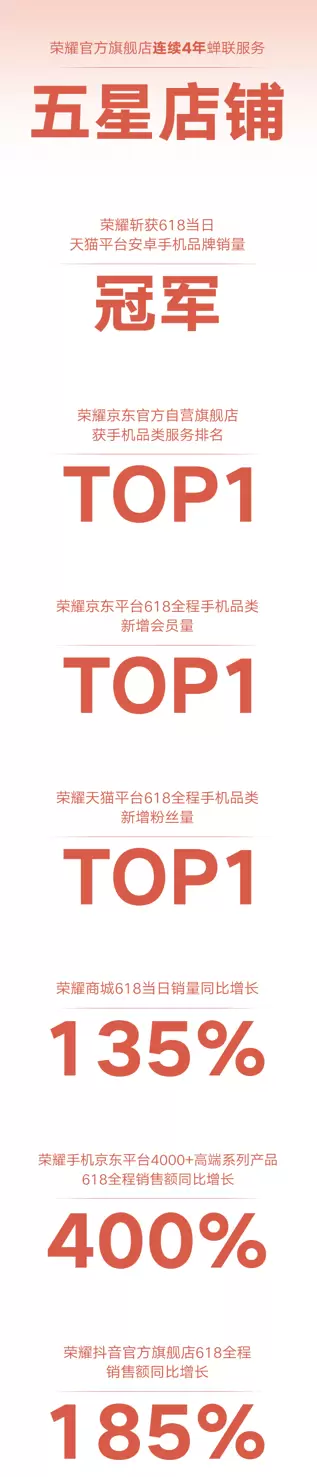 这些数字背后是荣耀始终如一的坚守——坚持以消费者为中心,把消费者的体验放在第一位。正是荣耀以消费者为中心的产品和服务,荣耀官方旗舰店连续4年蝉联服务五星店铺。荣耀京东平台618全程手机品类新增会员量TOP1,荣耀天猫平台618全程手机品类新增粉丝量TOP1,荣耀商城618当天GMV同比增长135%。荣耀手机京东平台4000+高端系列618全程产品成交额同比增长400%。荣耀抖音官方旗舰店618全程GMV同比增长185%。看得出来,消费者对荣耀的热爱和坚守亦始终如一。
