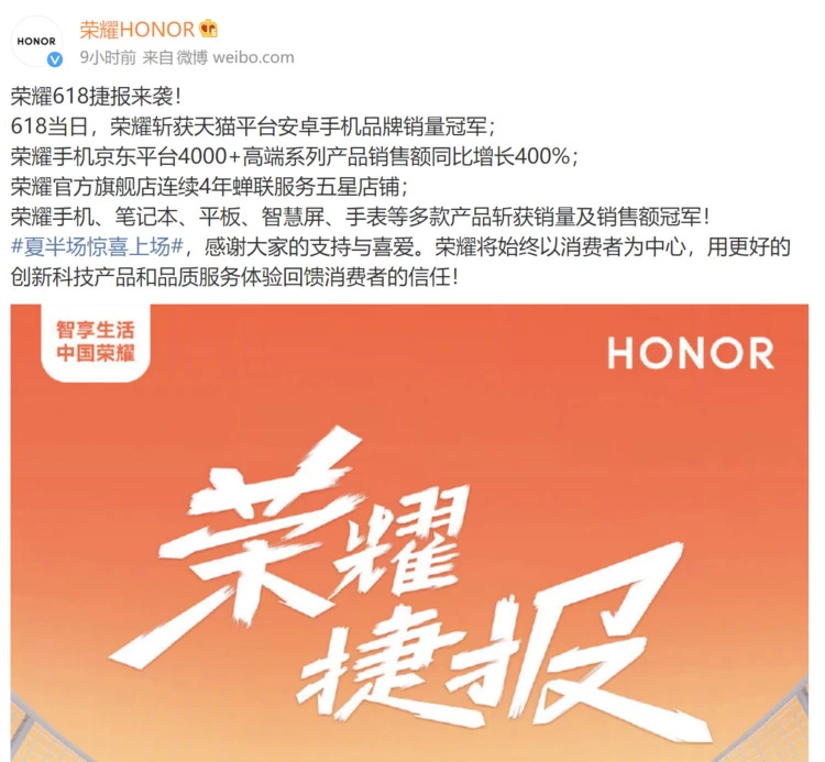 5月31日20:00起,到2022年6月18日24:00结束,荣耀斩获618当日天猫平台安卓手机品牌销量冠军!荣耀手机京东平台4000+高端系列产品销售额同比增长400%。荣耀手机、笔记本、平板、智慧屏、手表等多款产品斩获销量及销售额冠军!