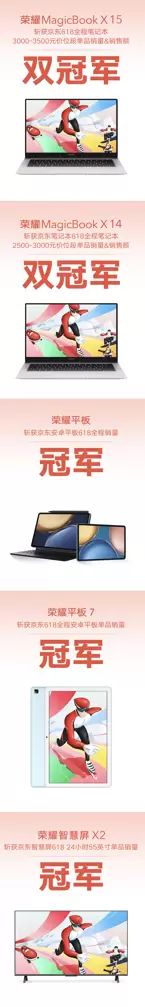 与中高端旗舰手机好评如潮相呼应的,是荣耀全场景智慧产品百花齐放。荣耀MagicBook 16 Pro 斩获京东笔记本巅峰28小时16英寸单品销量&销售额双冠军。荣耀MagicBook X 14 2021 斩获京东笔记本巅峰28小时2500-3000元价位段单品销量&销售额双冠军。荣耀智慧屏 X2斩获京东智慧屏618全程55英寸段单品销量冠军。荣耀平板斩获京东安卓平板618全程销量冠军。这份不俗的表现,意味着荣耀正通过强大的软硬协同能力,持续释放出软硬件的潜能,打通硬件、系统、生态间的壁垒,让更多人消费者享受荣耀全场景生态带来的智慧生活。