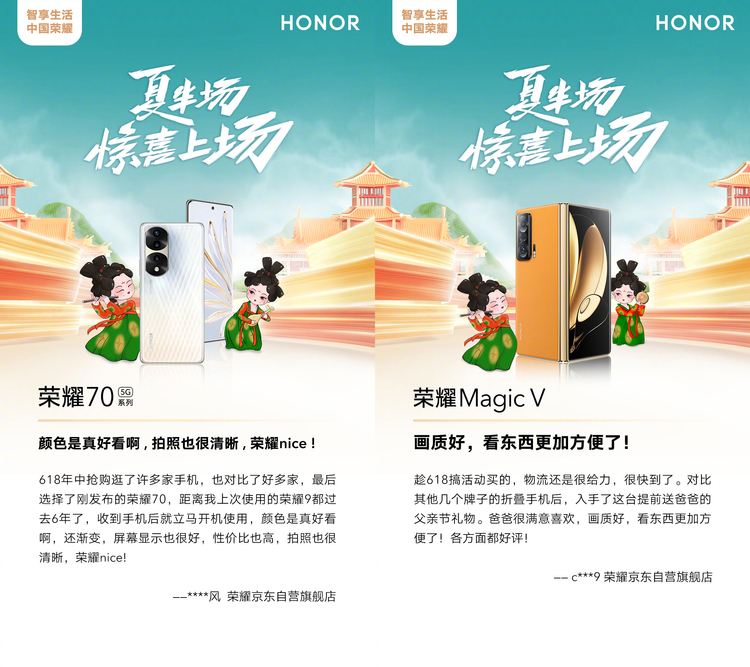 除了消费体验,产品力一直是荣耀的“拿手好戏”。荣耀以终结用户使用痛点为诉求,通过持续不断的科技创新,为用户带来全面进化的产品体验。荣耀Magic V斩获天猫618当天&全程折叠屏手机销量冠军,荣耀70系列斩获京东&天猫&抖音&快手618全程手机新品销量冠军,荣耀X30斩获京东618当日1500~2000元价位段单品销量冠军。另外,荣耀产品及服务用户好评连连,不少用户表示“颜值好看,性价比高”“爸爸很喜欢,看东西更方便”。荣耀将消费者的支持与喜爱铭记在心,坚持科技创新,用更进一步产品体验回馈消费者的信任。
