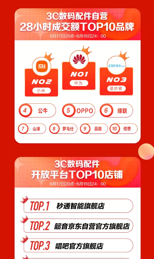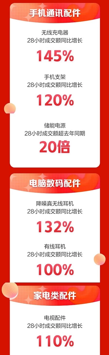 6月17日晚8点,京东618开启巅峰28小时,凭借着专业潮玩好物与贴心的服务保障,用户消费需求得到集中释放,3C配件潮品大卖创下新高战绩。28小时最高成交金额品类为蓝牙/无线耳机,其中趋势品类降噪真无线耳机成交额同比增长达132%;户外电源成交额同比增长2000%;无线充电器成交额同比增长145%;电视配件成交额同比增长110%;开放平台超2000家店铺成交额同比增长超100%……手机、电脑数码、家电等全品类配件单品均迎来销量新高,同时有力地助推平台商家实现业绩增长,在有责任的供应链与品质服务等作用下,京东3C配件618正全力守护着最美的人间烟火气。