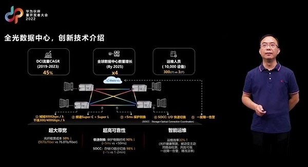 数据中心互联网络(DCI)是行业数字化转型的重要基础设施。随着大数据、云计算、移动互联网快速发展,全球数据中心的流量和数量与日俱增。根据相关报告,DCI流量年复合增速达到45%,全球数据中心的数量也将增加4倍以上。流量持续的高速增长,也意味着运营成本的增加。因此,通过技术创新,帮助企业建设能满足数字化发展的更高速、可靠、高效的联接,成为了华为的投入方向。