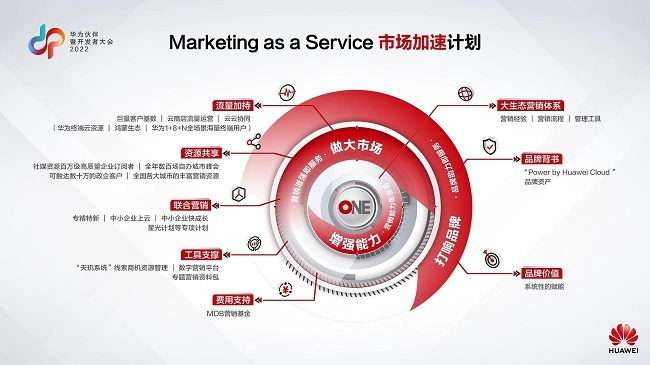 在《ONE—华为云和TA的朋友们2022》——华为伙伴暨开发者大会2022期间的一场特别节目上,华为云中国区副总裁、华为云中国区CMO张鹏宣布了面向伙伴的能力赋能计划——Marketing as a Service市场加速计划,赋能伙伴和开发者将创新带入畅销通道,全方位助力商业成功。