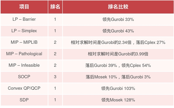 (根据2022年6月19日测评数据,主要测评数据来自Mittelmann测评榜单,两项Cplex数据来自数据魔术师)