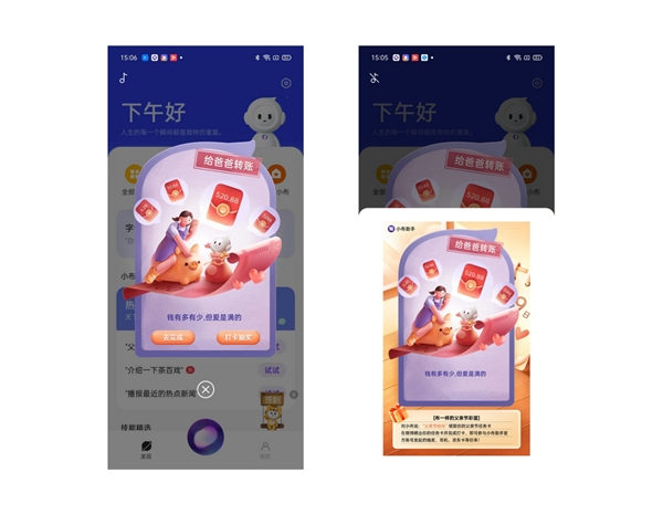 此外,小布助手APP在父亲节期间同步上线了“布”一样的彩蛋功能——用户只要对小布说一句:“父亲节快乐”或者“老爸节日快乐”,即可随机获得一张“父亲节任务卡”。这个功能体现了智能助手的人性化,通过传达年轻人对父母的关怀,有助于加强家人之间的情感连接。