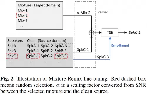 另外,目前大多数主流的目标语音提取系统都是受监督学习驱动的,它们对训练数据有着很强的依赖。由于源域和目标域的声学特性之间存在着一定程度的不匹配,域内和跨域条件下的目标语音提取之间通常有着巨大的性能差异。因此,论文还提出了一种Mixture-Remix机制(Fig2所示)来提高跨域条件下的目标语音提取性能。